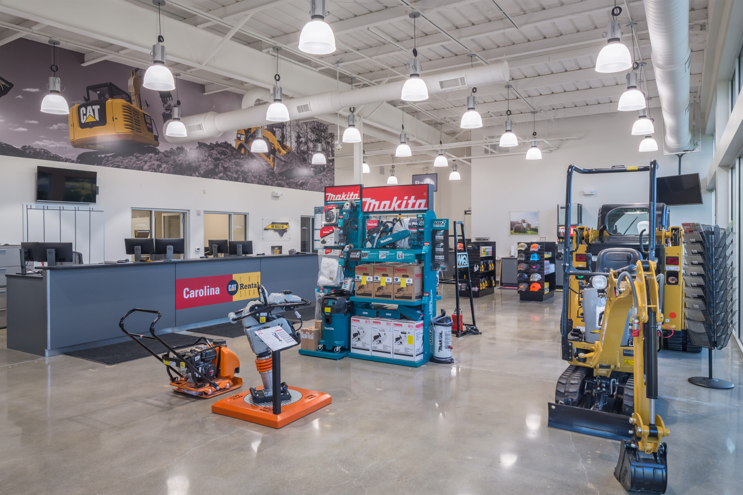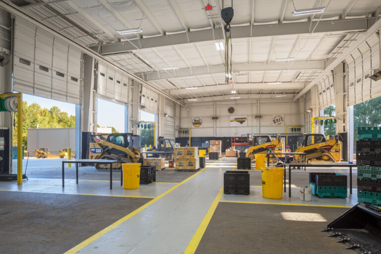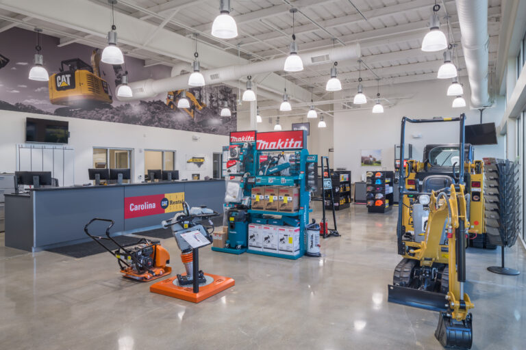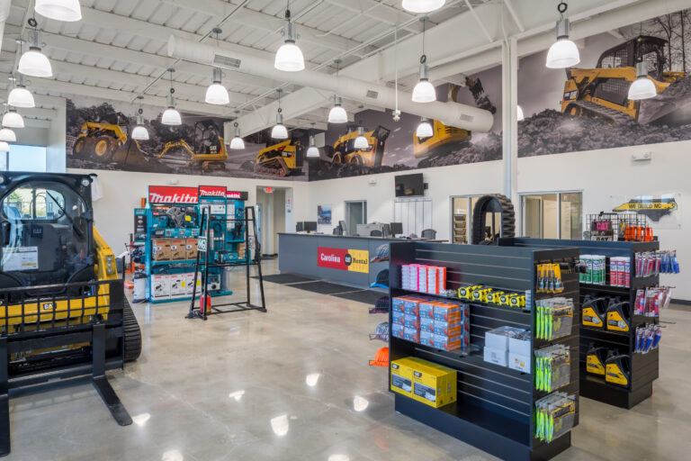 Playbook was hired by Carolina Tractor & Equipment, CTE to manage the programming and construction management for their new CAT North Rental Store in Charlotte. This location included renovating an existing facility to include a new parts and sales retail showroom, offices, workstations, breakroom and conference room space. Site construction included a new wash bay and site concrete and stone placement for equipment staging and storage.