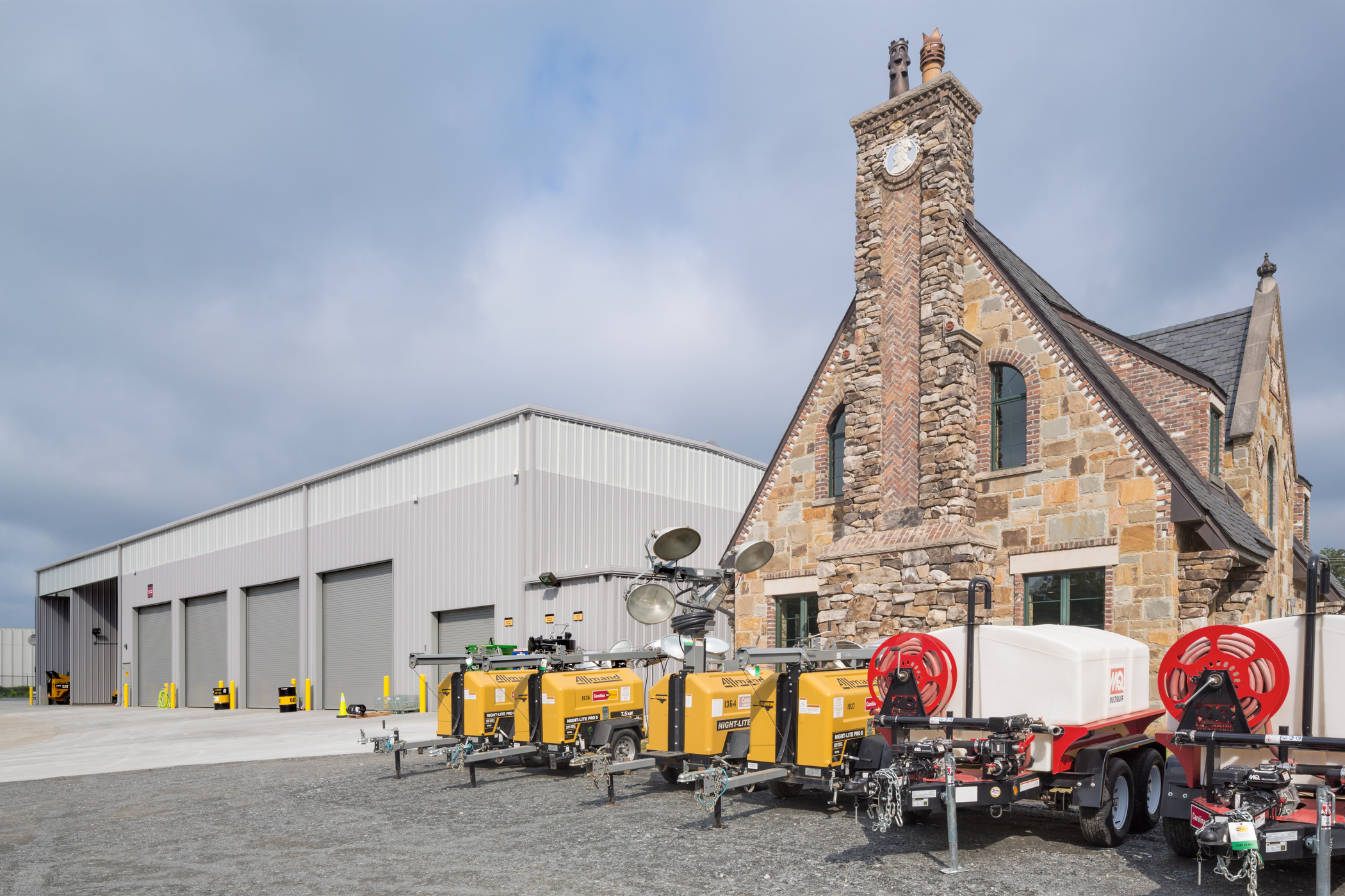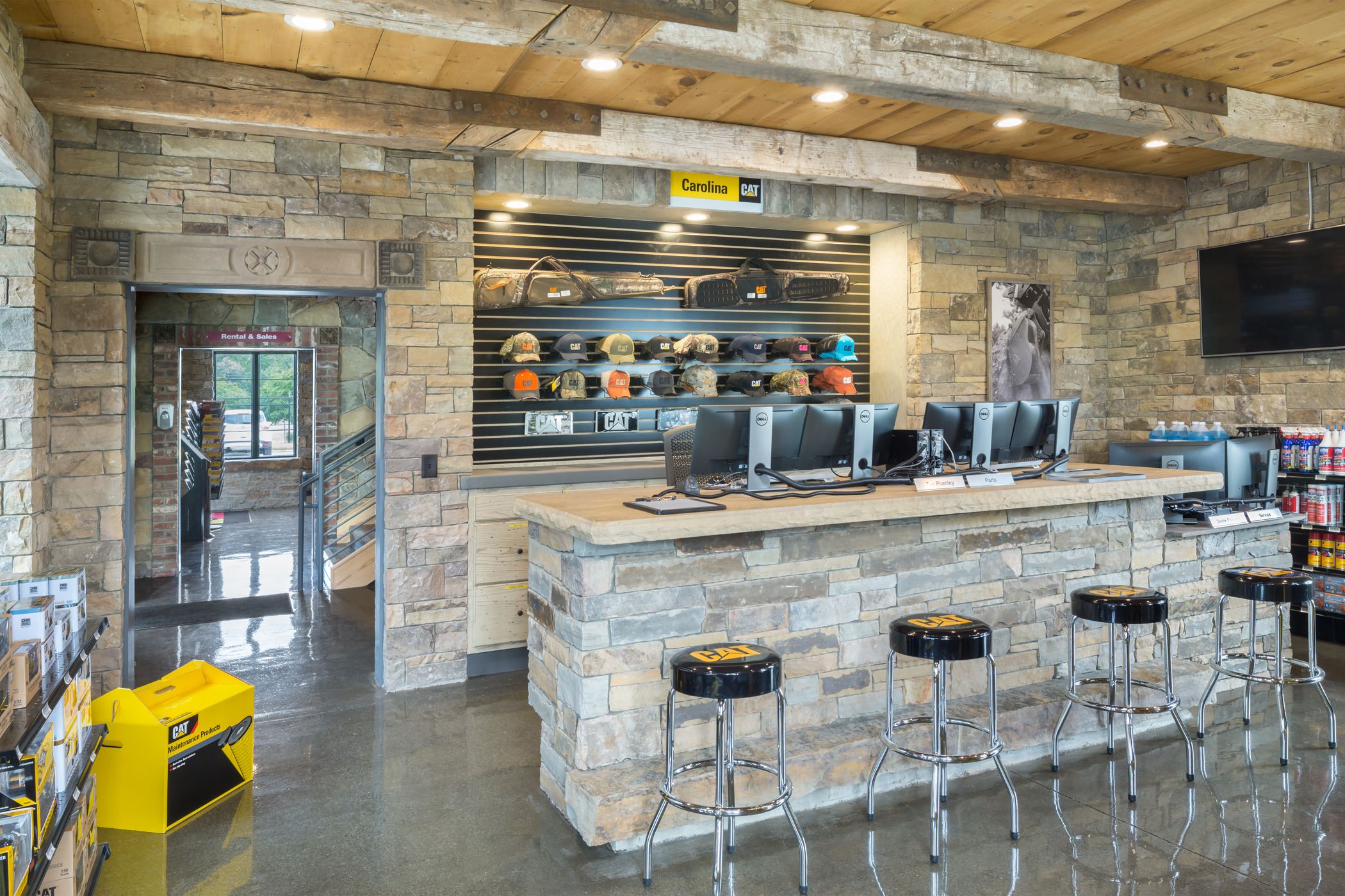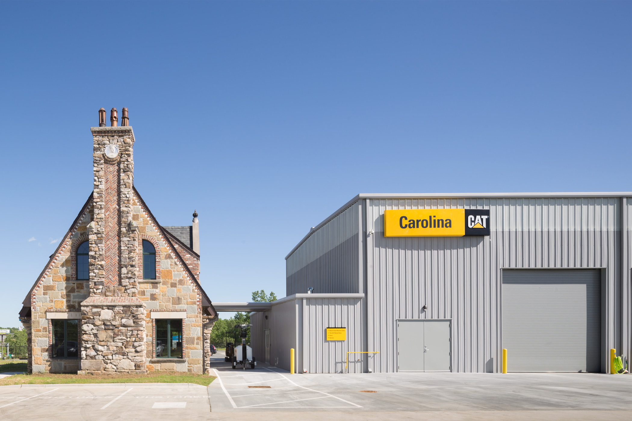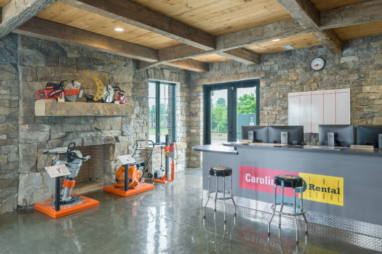 Playbook was hired by Carolina Tractor & Equipment, CTE, to manage the programming and construction management for their new CAT South Rental Store in Pineville, NC. This location included a renovation of an existing stone house for CTE’s parts and sales retail with second-floor offices. An 8,000 SQFT new service shop was attached, and a wash bay was constructed.