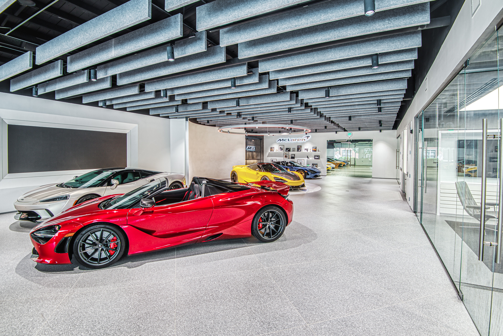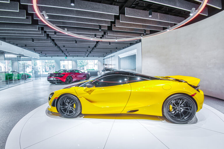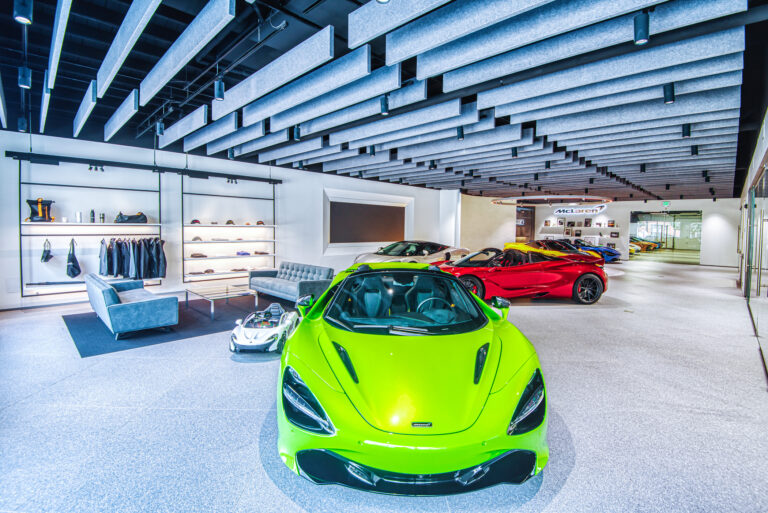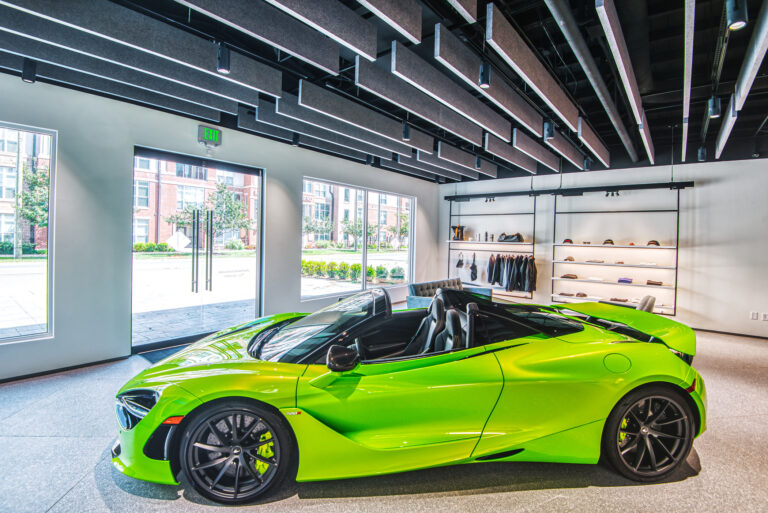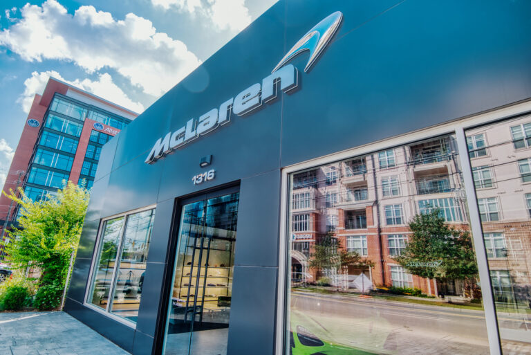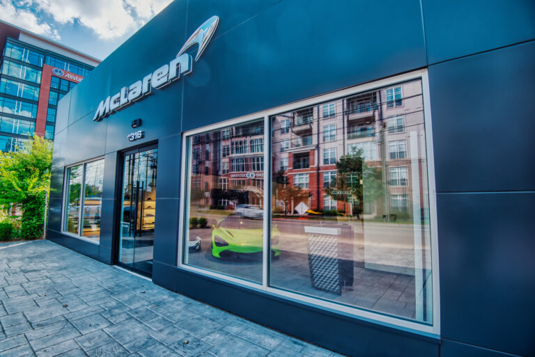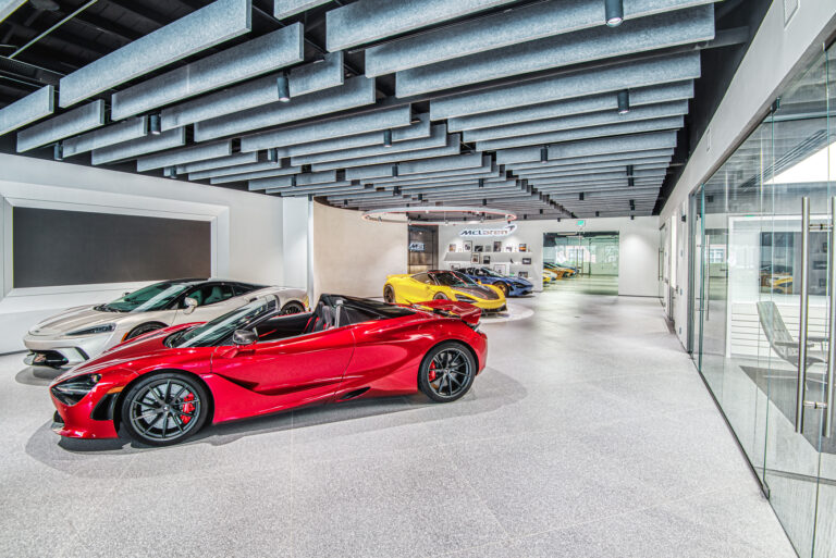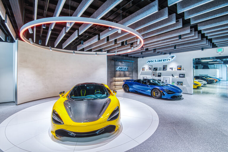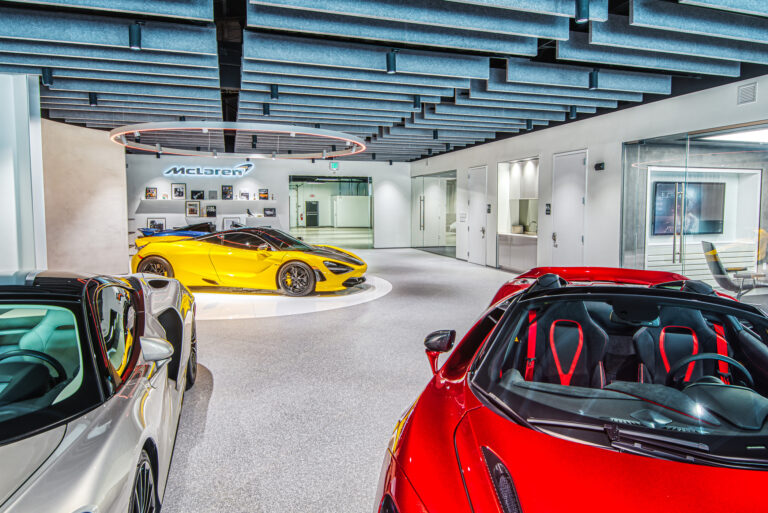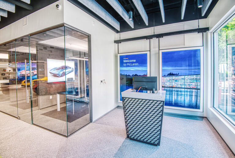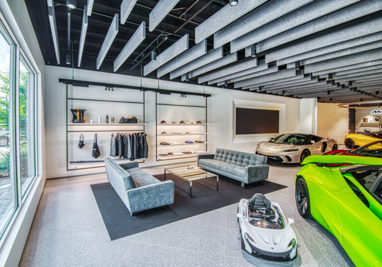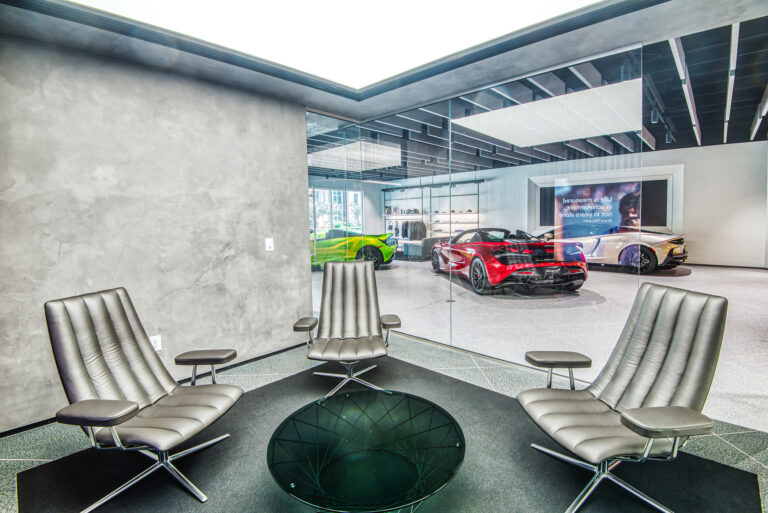 McLaren Charlotte chose Playbook as their project management partner to renovate an existing 9,000 SQFT dealership into a new McLaren Dealership. The exterior of the building was refaced with aluminum composite metal panels, new windows, glass entry doors and exterior lit sign. The showroom space included design elements of large ceramic floor tiles, baffle ceilings, new lighting, high-end office and lounge furniture, touch-screen configuration displays and a video wall featuring a direct feed of the McLaren manufacturing facility in England.