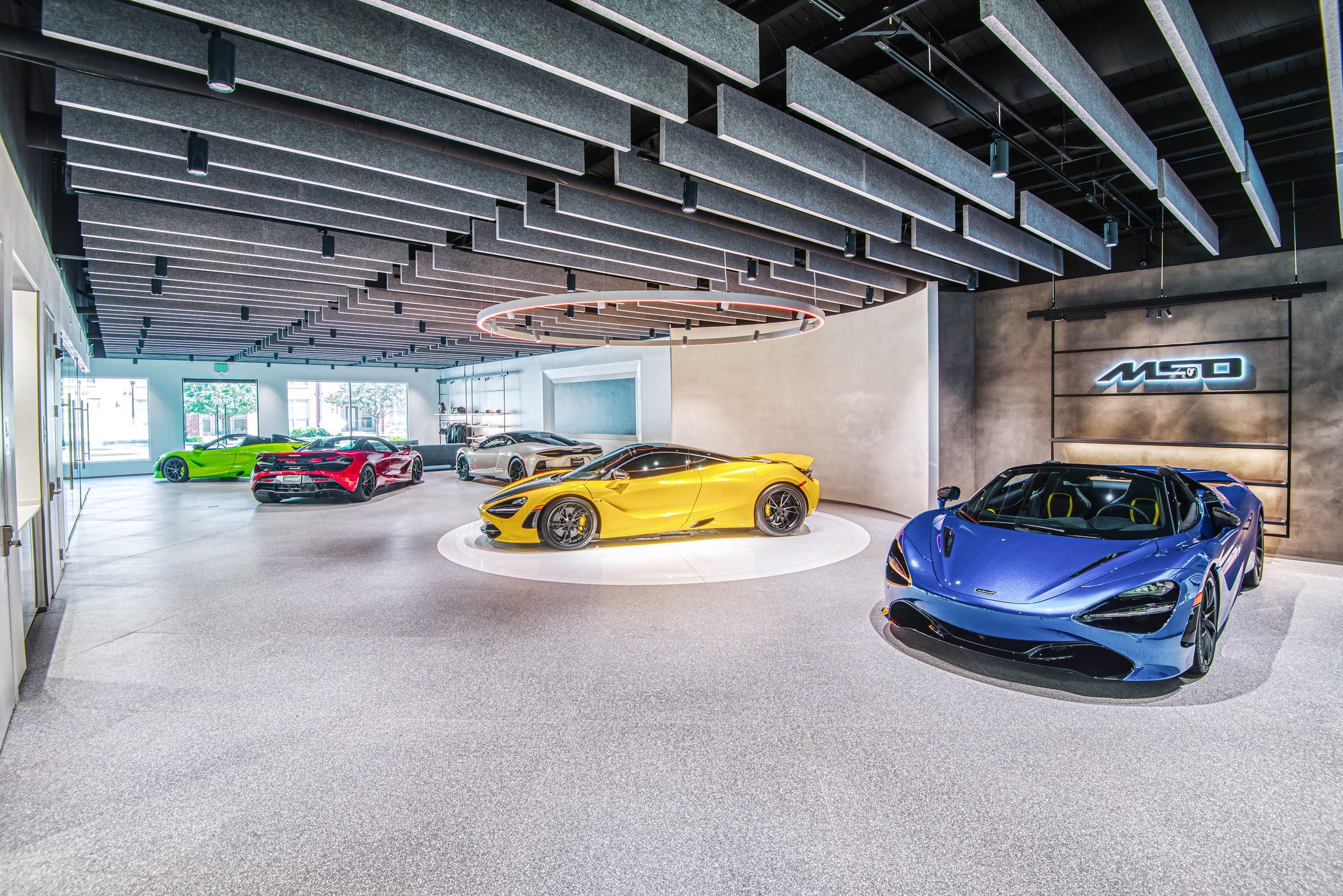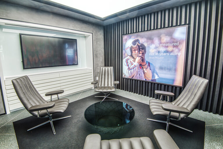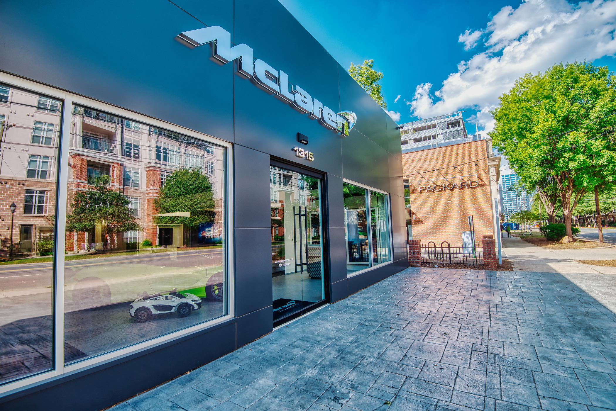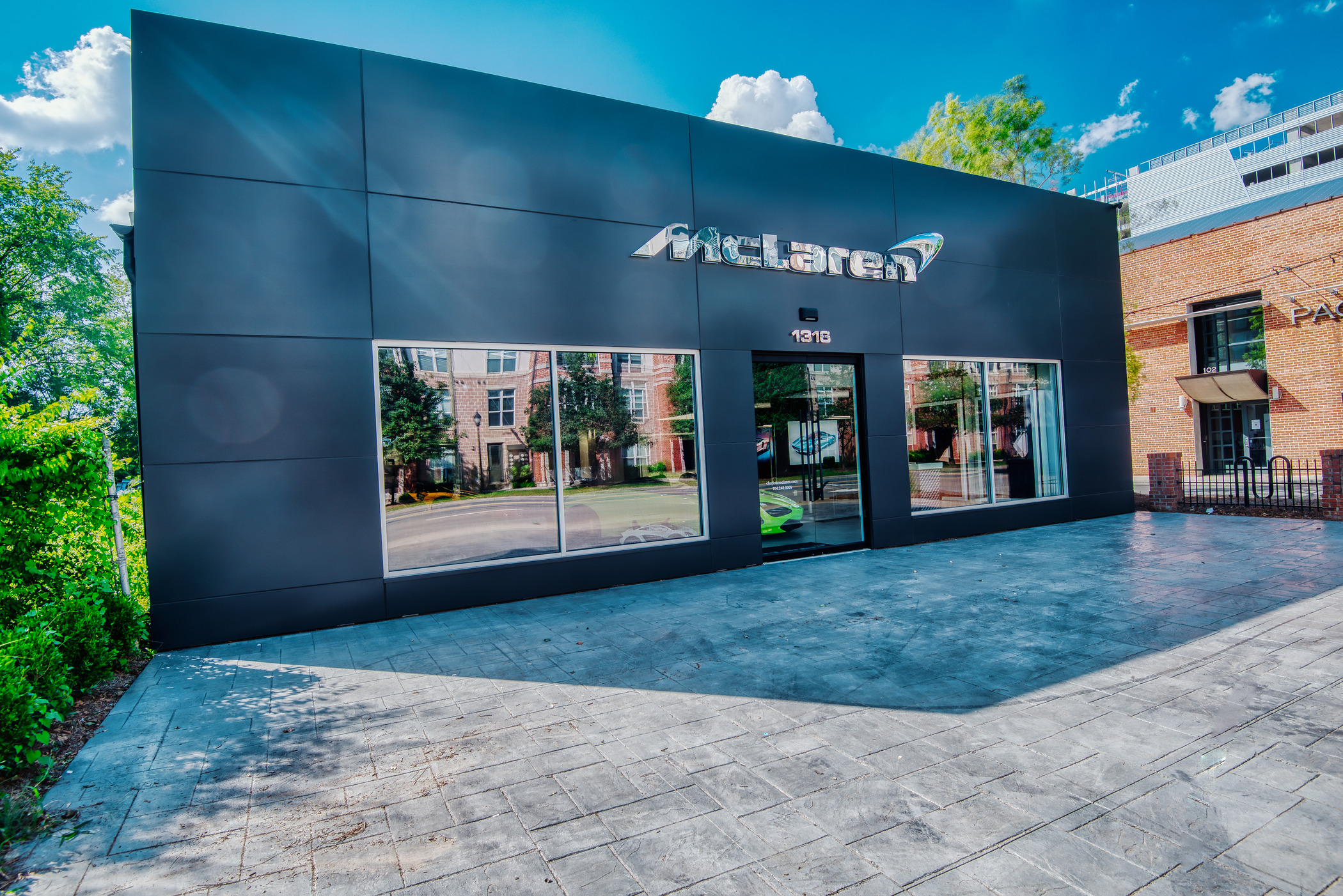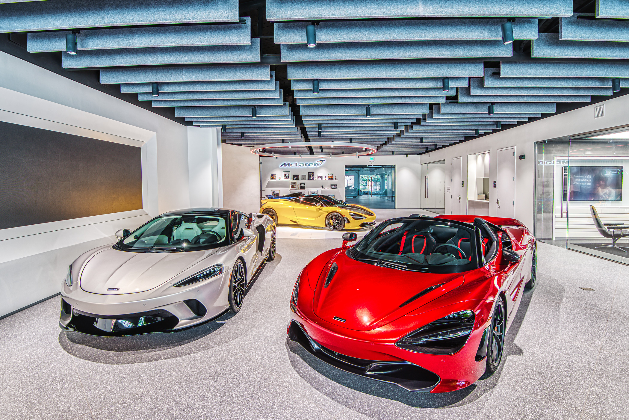 McLaren Charlotte chose Playbook as their project management partner to renovate an existing 9,000 SQFT dealership into a new McLaren Dealership. The exterior of the building was refaced with aluminum composite metal panels, new windows, glass entry doors and exterior lit sign. The showroom space included design elements of large ceramic floor tiles, baffle ceilings, new lighting, high-end office and lounge furniture, touch-screen configuration displays and a video wall featuring a direct feed of the McLaren manufacturing facility in England.