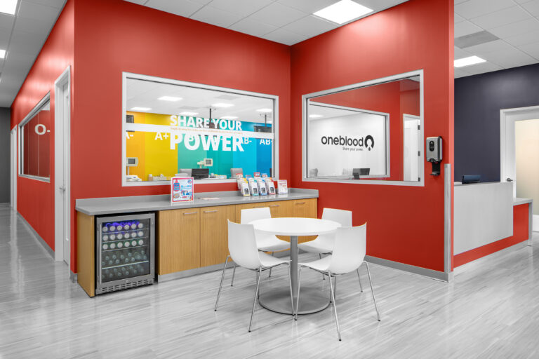 Located within an existing retail shopping center, the interior upfit included a welcoming main lobby, administrative offices, donor collection areas, and back-of-house space for equipment and blood storage. The project also involved restriping the parking lot to accommodate OneBlood’s mobile donation fleet, along with modifications to the rear of the center to support loading and unloading of equipment and supplies.