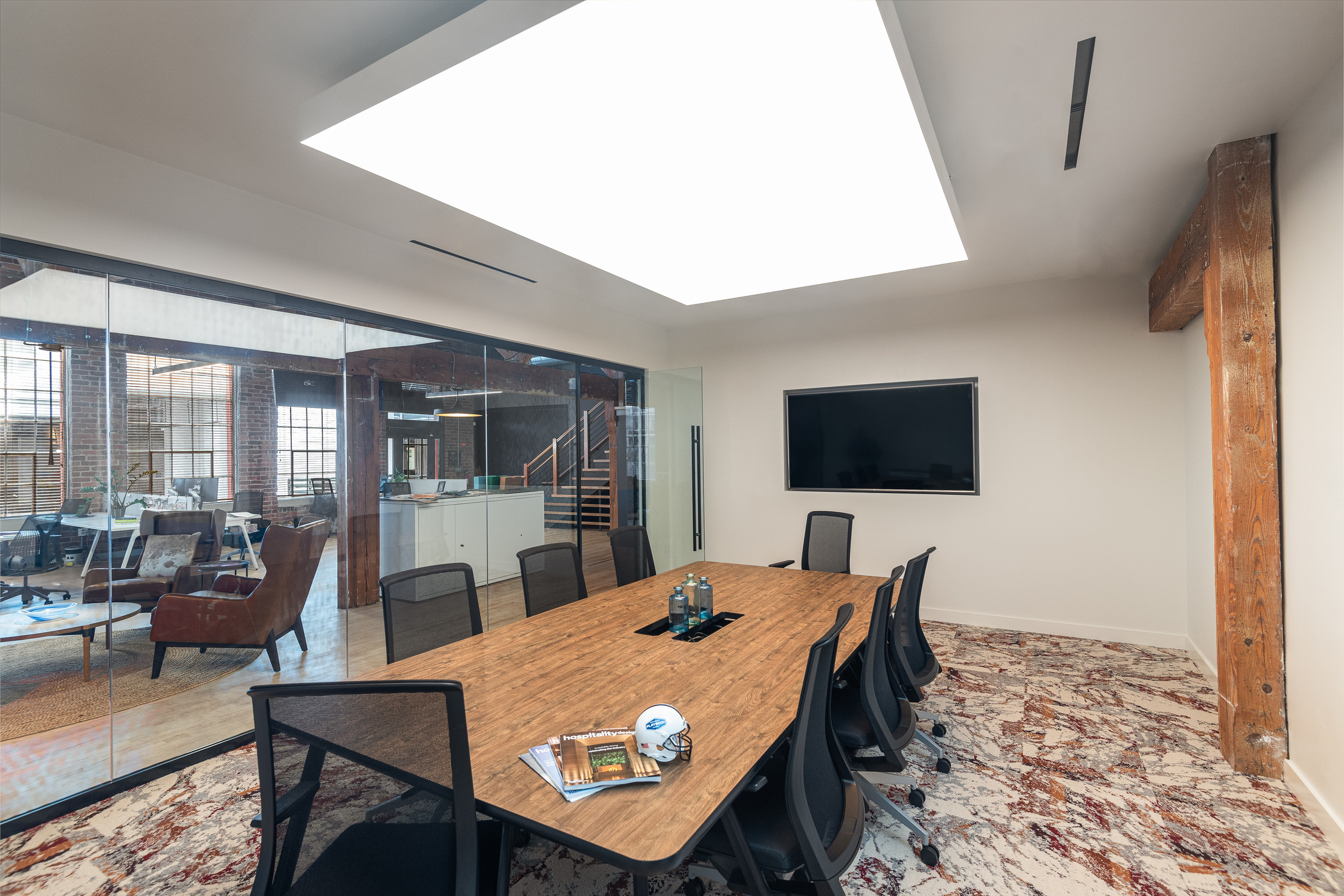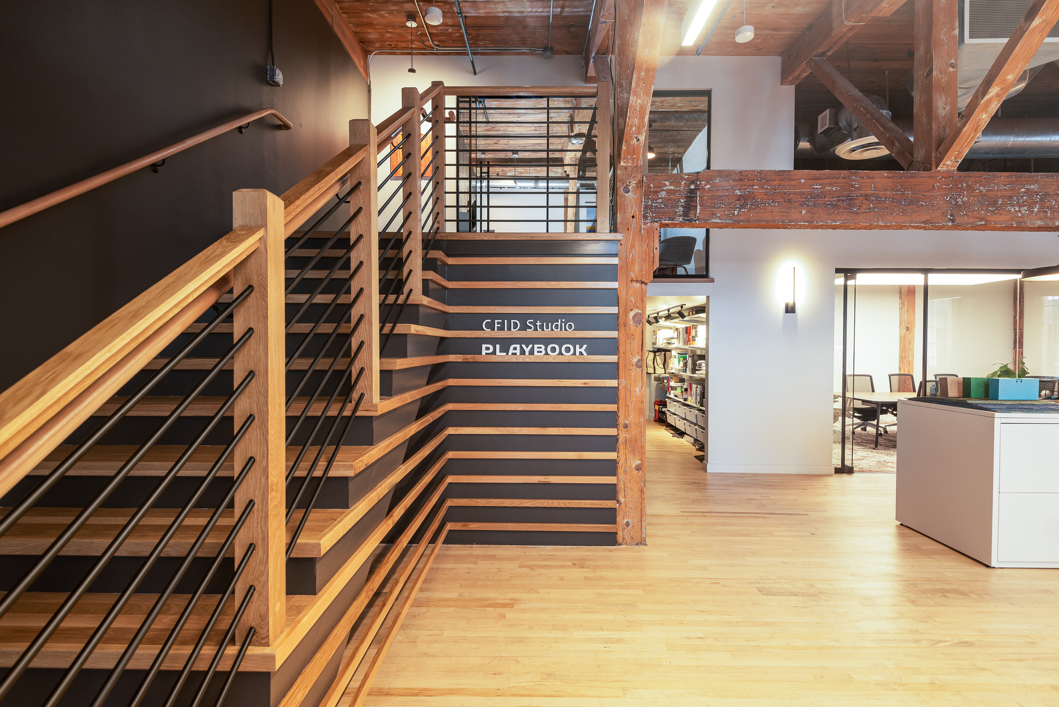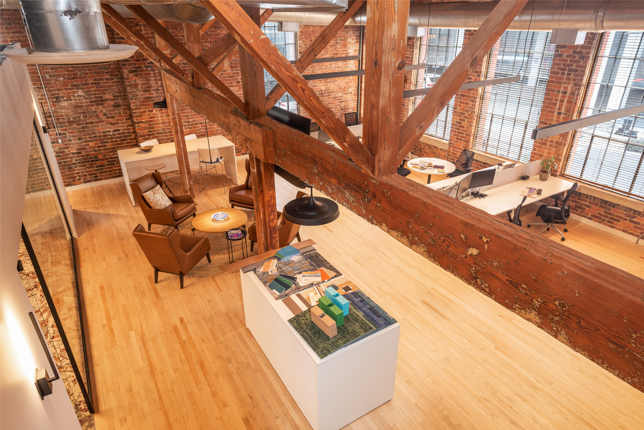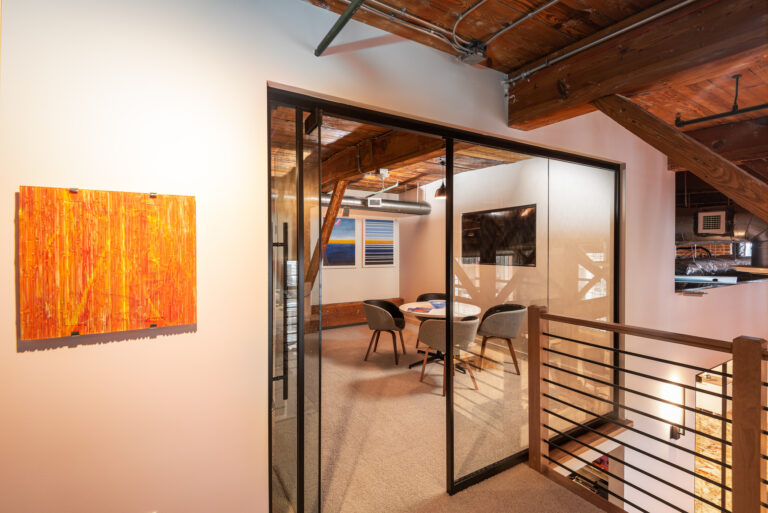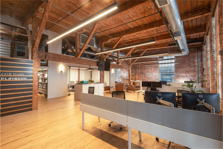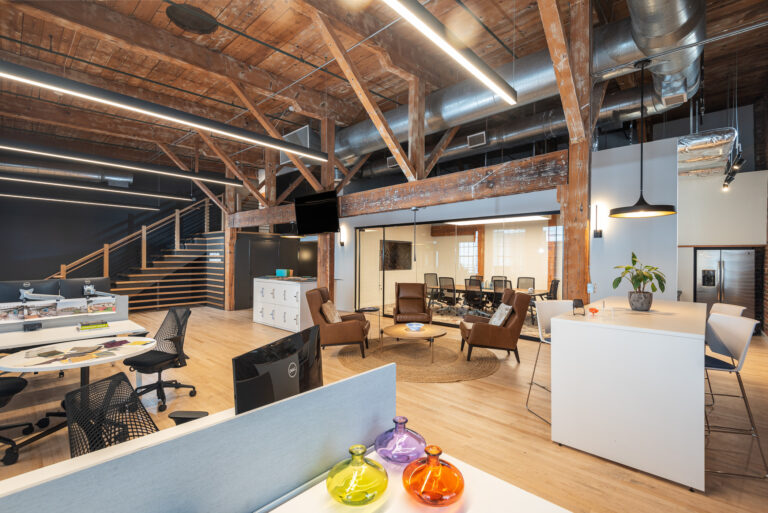 The upfit preserved original features such as 17-foot wood ceilings, heavy timber beams, exposed brick and 100-year-old hardwood floors. The new space has open-concept workstations, enclosed heads-down rooms and casual collaboration areas.