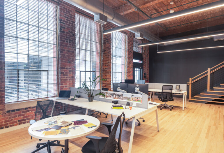 In 2022, Playbook Management Company and Carrie Frye Interior Design moved their custom co-working space from Montford Park to Atherton Lofts, a historic cotton mill building in South End.