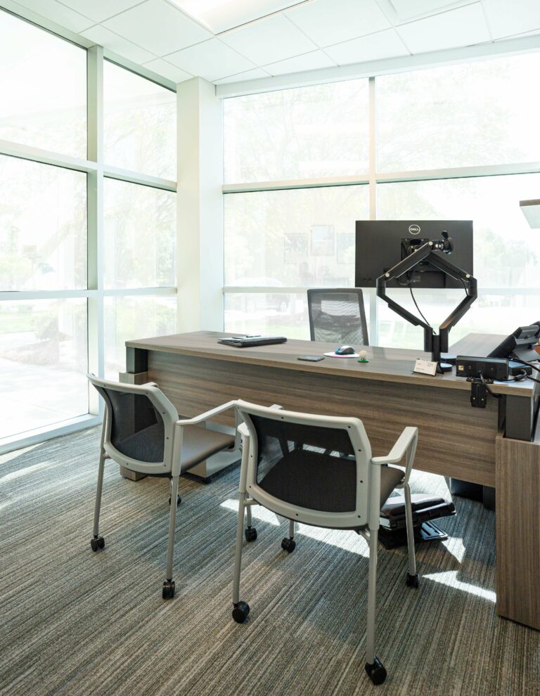 Key elements include separate entrances for clients and employees, open workstations, private offices, conference rooms, and a collaborative breakroom—creating a functional, welcoming environment that supports both the customer experience and internal operations.