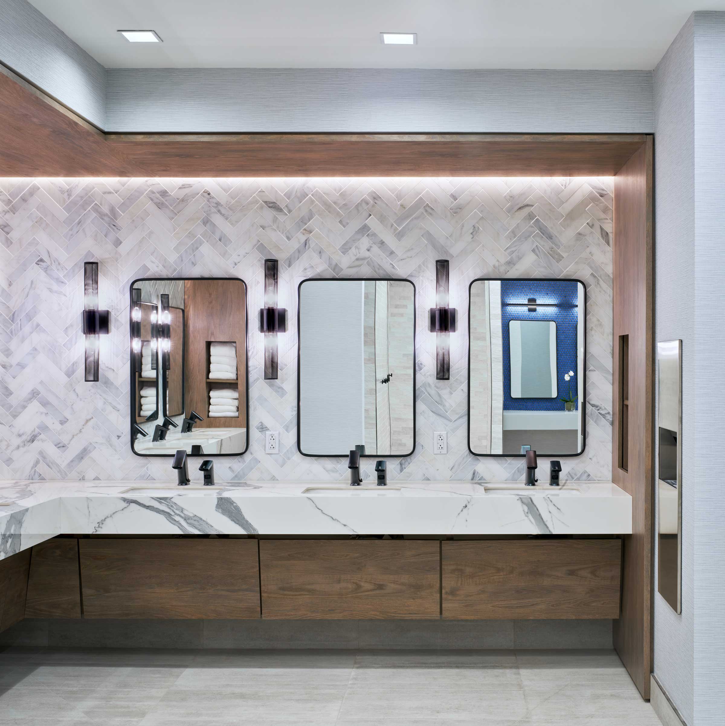 Serving as Owner’s Representative, Playbook led preconstruction, design and permitting, decommissioning, construction oversight, FF&E coordination, and punchlist management. The renovated spaces feature open office layouts with conference and collaboration areas, café-style break spaces with expanded food and beverage options, high-tech video conferencing capabilities, updated restrooms, a new mail and copy center, security office, studio space, and the addition of outdoor terraces on three building floors.