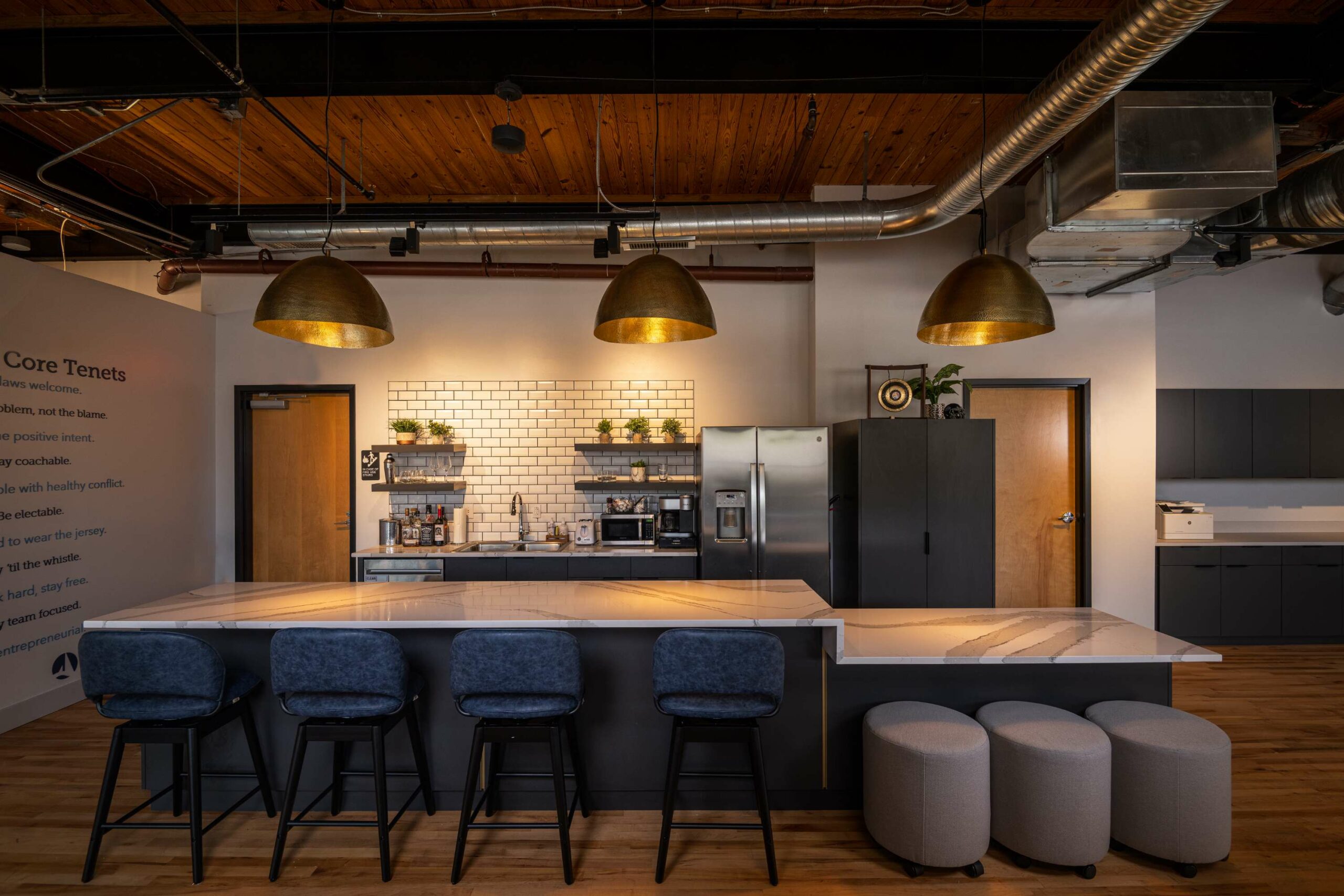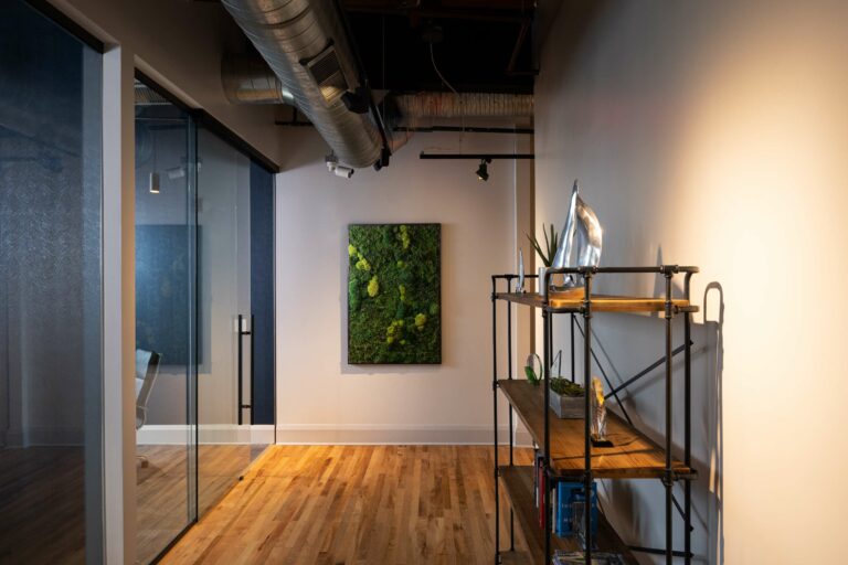 Layered branding and thoughtful design elements create a warm, inviting workplace that supports flexibility and choice. Casual collaborative seating areas, moss walls, and specialty lighting fixtures enhance the environment, allowing associates to choose how and where they work best.