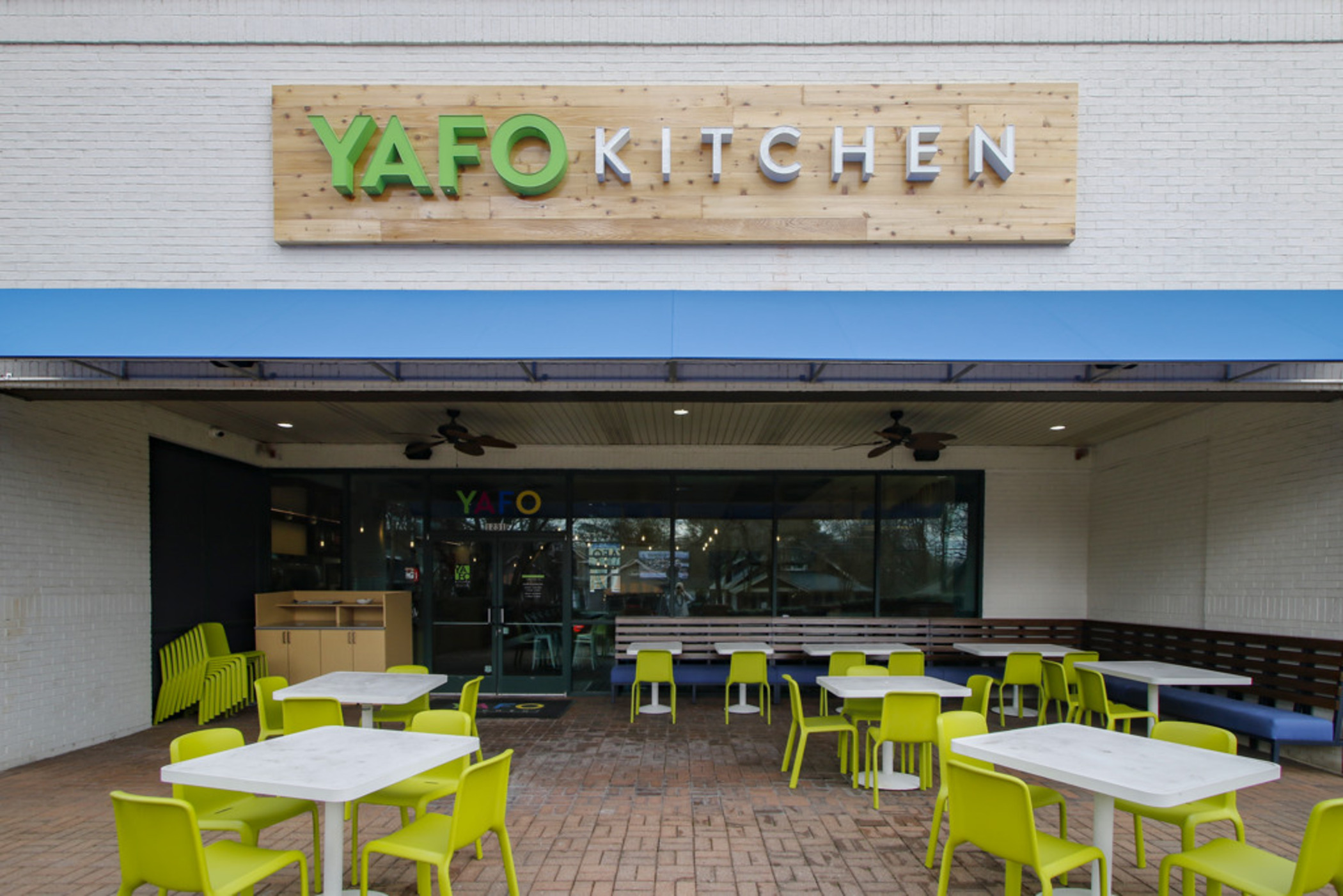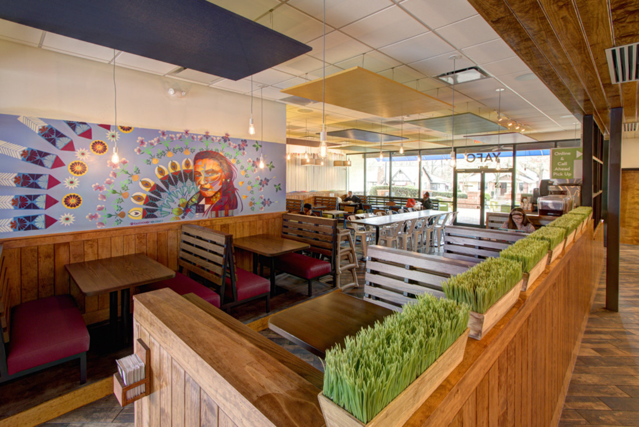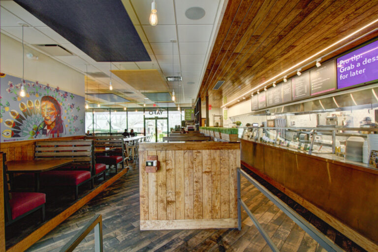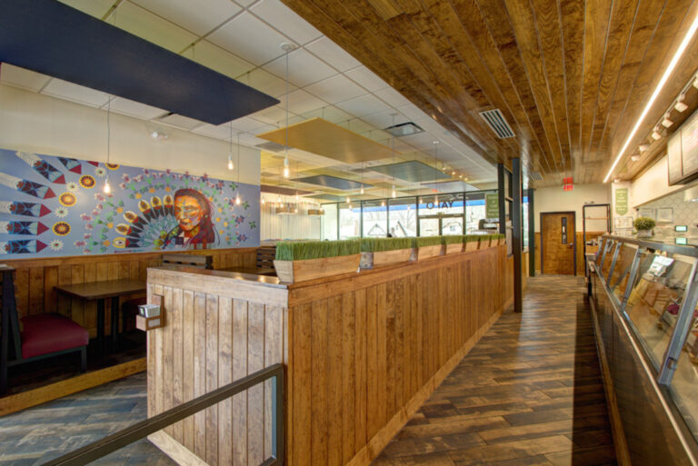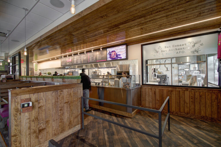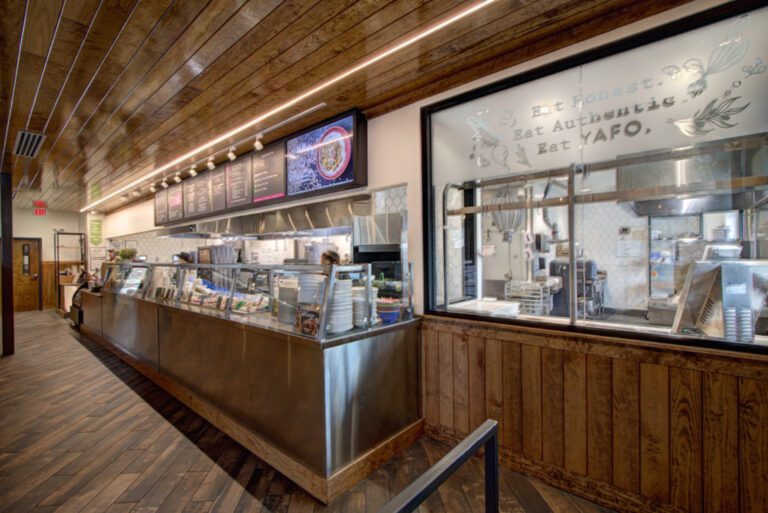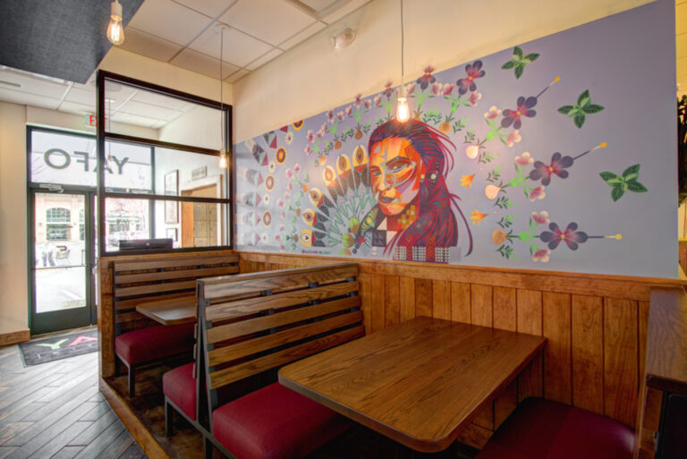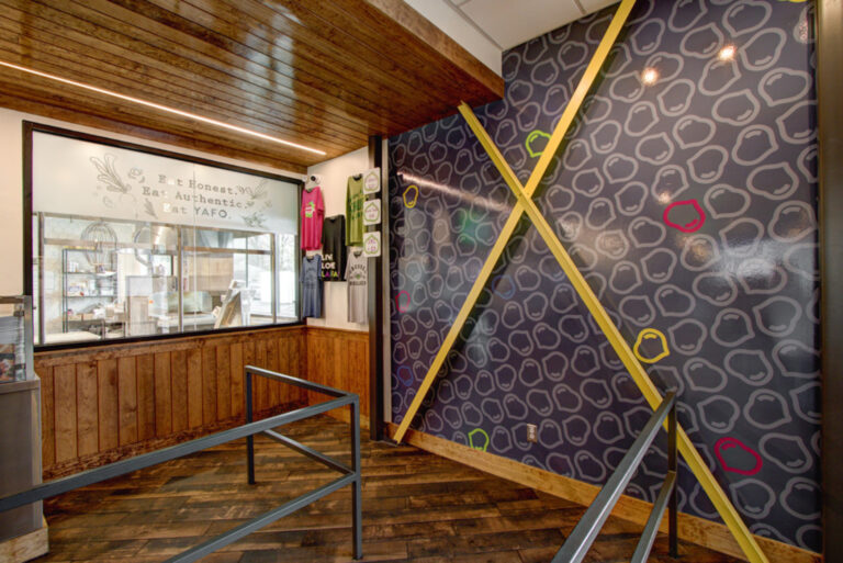 Yafo Kitchen hired Playbook for their new location on East Boulevard in Dilworth. Yafo renovated the 3,710 SQFT existing restaurant space to align with their brand and concept. The new space was Yafo’s third location in Charlotte and design elements included artist murals, custom dining booths, wood walls and ceiling, and an outdoor patio.
